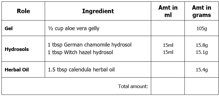 I have never been fond of mathematical equations and essential oils do not always fit into precise calculations so the first number chosen is, in a sense, a bit random whilst at the same time maintaining its relation to the others. In this example, German Chamomile and Sweet Marjoram are the two most potent essential oils while Helichrysum is a little more potent than Lavender. Hence, I chose to work with the most potent oils first by designating 3 drops for German Chamomile and 6 drops for Sweet Marjoram. This added up to 9 drops leaving 21 drops to be divided between the other two oils. I then examined the varying strengths of the Helichrysum and Lavender in my repertoire of essential oils and decided on 9 drops for Helichrysum and 12 drops for Lavender.