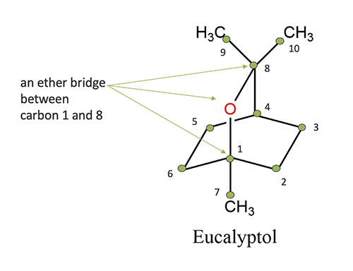 NOTE: The ethers are a unique chemical family in that it is hard to generalize about the whole family. The main ether component found in essential oils is eucalyptol. Most of the other oxides are found as minor components of essential oil, generally at less than 1 to 3%, with the exception being the bisabolols, which can occur as major components of German chamomile essential oil. We will focus our attention on eucalyptol in the sections that follow.