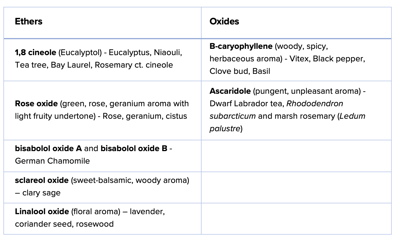 Epoxides (3-membered rings) are chemically oxides. Larger cyclic ethers are just ethers, despite often being called “oxides” in essential oil nomenclature. Both can appear in essential oils, have similar volatility, and contribute to aroma, but their chemical classification is different.